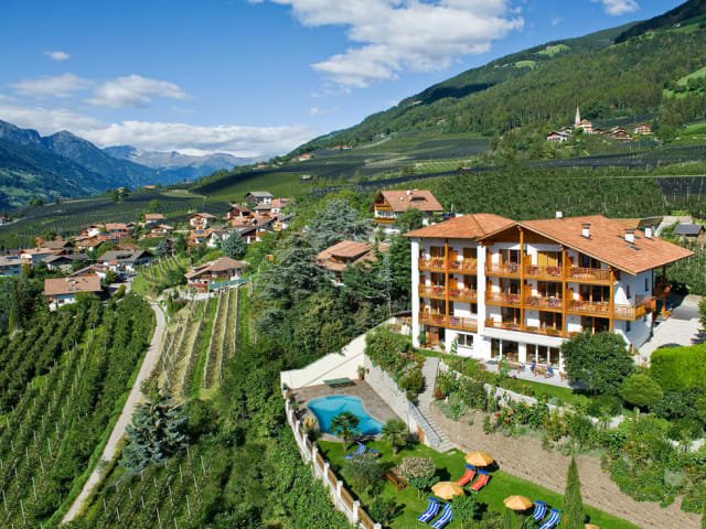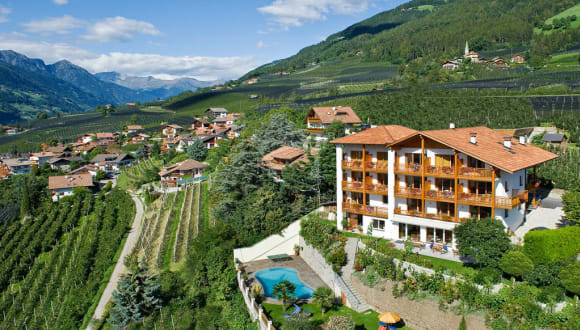 Das Hotel-Garni Ehrenfels in Schenna ist die perfekte Wahl für alle, die einen erholsamen und entspannten Urlaub mit Panoramablick auf Meran und die Alpen genießen möchten. Entspannen Sie im Garten des Hotels auf den Liegestühlen und im Außenpool und Whirlpool und genießen Sie das abwechslungsreiche Frühstücksbuffet mit Panoramablick auf der Terrasse der Bar.
