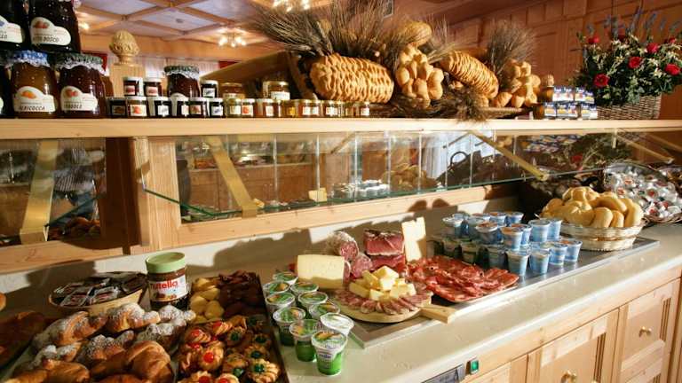 Das Frühstücksbuffet umfasst sowohl süsse als auch herzhafte Produkte, darunter hausgemachte Kuchen und Guetzli, Aufschnitt, Chäseplatten und Eier. Eine Bar steht ebenfalls zur Verfügung.