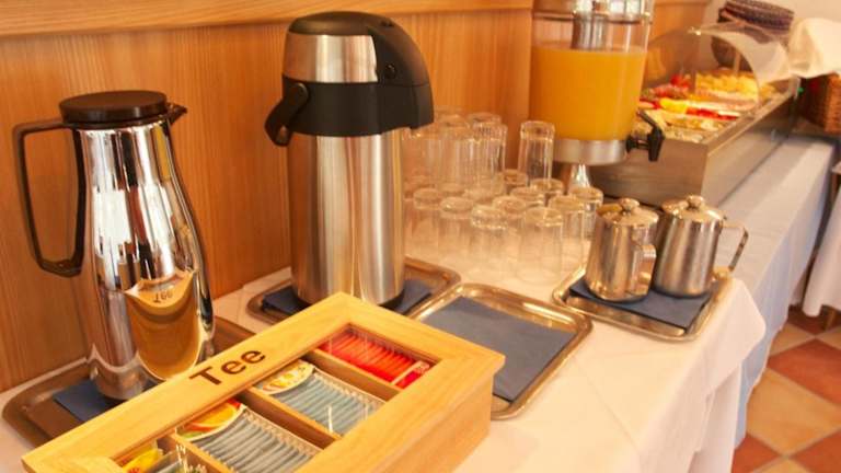 Das reichhaltige Frühstücksbuffet wird täglich im hellen Frühstücksraum serviert und bietet eine Vielzahl von Köstlichkeiten für einen gelungenen Start in den Tag.
