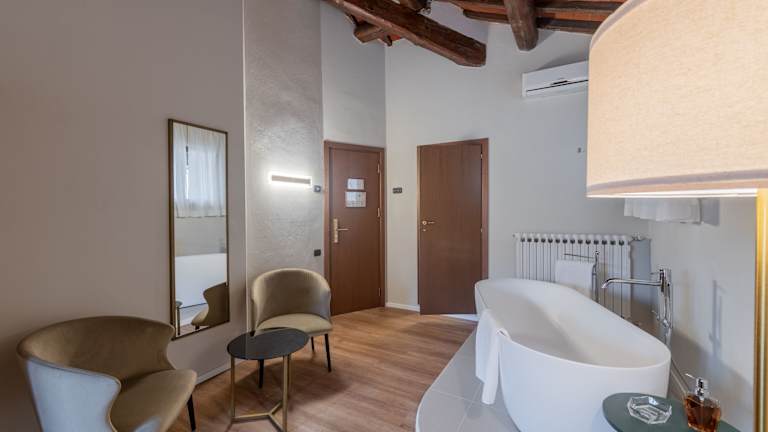 Die Zimmer sind elegant eingerichtet und verfügen über eigene Badezimmer. Sie sind mit Klimaanlage, Heizung, einem Doppelbett oder Queensize-Bett, einem Safe, einer Minibar, einem Schreibtisch und einem Minikühlschrank ausgestattet. Zu den weiteren Annehmlichkeiten gehören ein Direktwahltelefon, ein TV-Gerät und kostenfreies WLAN. Einige Zimmer bieten freiliegende Holzdeckenbalken und alle Badezimmer sind mit Dusche, Badewanne, Bidet, Haartrockner und Kosmetikartikeln ausgestattet. Rollstuhlgerechte Zimmer mit barrierefreiem Bad sind ebenfalls verfügbar.
