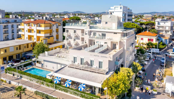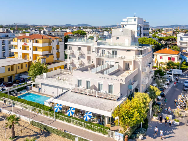 Das Hotel Gemma sul mare in Riccione überblickt direkt den Strand, der mit wenigen Schritten leicht zu erreichen ist, ideal für Reisende mit Kindern. Das Hotel ist nur wenige Minuten vom Zentrum von Riccione entfernt, und die Viale Dante ist nur 100 Meter entfernt, perfekt für einen abendlichen Spaziergang. Für eine einzigartige Entspannung finden Sie hier einen Swimmingpool mit Blick auf den Strand. Um neue Energie zu tanken, können Sie in den Whirlpool eintauchen, sich beim Schwimmen abkühlen oder sich auf den Liegen in der Sonne ausruhen. Und jeden Sonntag ein Aperitif am Pool, um die Woche stimmungsvoll ausklingen zu lassen! Die Zimmer sind sicher und renoviert und erinnern an die Farben des Meeres. Die Zimmer sind wahre Oasen der Ruhe, komfortabel und einladend. Jeder Zimmertyp, von der Suite bis zum Top-Meerblick, der von den Familienzimmern ausgeht, ist mit allen Dienstleistungen ausgestattet: bequemes Bett, großer Balkon, von dem aus Sie das Meer bewundern können, privates Badezimmer mit Dusche, unabhängige Klimaanlage, kostenloses WLAN und Farbfernseher, Direktwahltelefon, Safe, Haartrockner … Das Frühstücksbuffet ist ein wahrer Genuss am Morgen, den man auf der Veranda im Garten in der Nähe des Swimmingpools genießen kann. Hausgemachtes Gebäck, Müsli, frisches Obst der Saison, frisch gebackene Kekse, Brot und Marmelade, köstlicher Joghurt, Eier, Käse und Aufschnitt… Alles begleitet von einem guten Kaffee oder einer Tasse Cappuccino, Tee, Kräutertees und Fruchtsäften. Mittag- und Abendessen bieten den authentischen Geschmack der Romagna-Tradition, mit typischen Rezepten der Region, die in einem Gourmet-Schlüssel neu interpretiert werden. Das Restaurant, das auch im Michelin-Führer der besten Orte der Gegend aufgeführt ist, bietet täglich ein Wahlmenü mit Fleisch-, Fisch- und vegetarischen Gerichten sowie ein köstliches Buffet mit Beilagen, Vorspeisen, frischem Gemüse und Salaten! Den Aperitif bei Sonnenuntergang genießen Sie im Lounge-Garten mit Sofas und Kissen mit Blick auf die Strandpromenade. Die Dachterrasse bietet eine atemberaubende Aussicht und maximale Entspannung im Solariumbereich mit Liegestühlen. Das Hotel Gemma ist für die Unterbringung von Radfahrern mit speziellen Dienstleistungen ausgestattet: Fahrradaufbewahrung, Werkstatt, Fahrradverleih und nützliche Tipps für Routen, Straßen und Routen, die nach Schwierigkeitsgrad und Training differenziert sind. Das Hotel befindet sich auch in der Nähe des Schwimmstadions und bietet Sonderkonditionen für diejenigen, die es für Sportveranstaltungen wählen. Das Hotel Gemma bietet maximalen Komfort dank des privaten Parkplatzes, auf dem Sie Ihr Auto abstellen können.