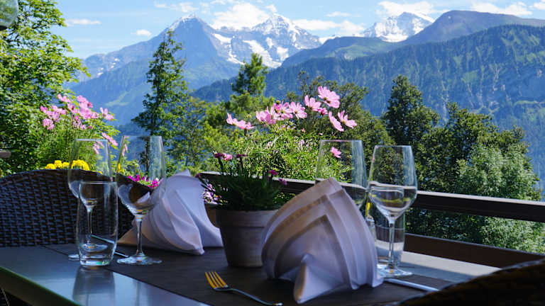 The charming family run boutique Hotel Gloria in Beatenberg offers spacious modern rooms, all with private balconies with unbelievable views of Lake Thun below & the Alps, including the famous Eiger, Mönch & Jungfrau. Hotel Gloria includes a panorama restaurant and a beautiful outdoor sun terrace. In the restaurant chef Bernhard creates a combination of Swiss classics and international specialties using the finest local produce. An extensive Wine list is also on offer. Situated just 500 metres from the Niederhorn Cable Car & Funicular Railway with a free bus service for Guests to Interlaken two minutes away It is perfectly located as a base for exploring the Bernese Oberland, offering fantastic Alpine hiking trails at the doorstep. Enjoy individual and friendly service from the owners Swiss Bernhard & Australian Jacky and their small dedicated team.
