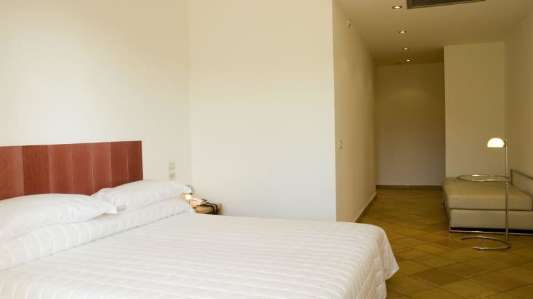 Die Zimmer sind mit Klimaanlage, Heizung und einem jeweiligen Balkon oder Terrasse ausgestattet, die einen Blick aufs Meer bieten. Sie verfügen über ein Doppelbett, einen Safe sowie eine Minibar. Kommunikations- und Unterhaltungsmöglichkeiten sind durch ein Direktwahltelefon, einen TV mit Satelliten-/Kabelempfang und Wifi gegeben. Das Badezimmer ist mit einer Dusche und Badewanne sowie einem Haartrockner ausgestattet. Es sind auch rollstuhlgerechte Zimmer mit barrierefreiem Badezimmer verfügbar.