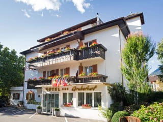 Die Rezeption, die Hotelbar, der Speisesaal, die Zimmer und die Gartenterrasse befinden sich im Haupthaus von unserem 3-Sterne-Hotel Gruberhof in Meran. Dort werden auch Frühstück, Kuchenbuffet und Abendessen serviert. Vor dem Haupthaus befindet sich ein wunderschöner, mediterraner Garten mit Palmen, Zypressen und Oleander sowie ein Freibad, welches zum Verweilen einlädt. An den Hotelgarten grenzt, umgeben von Apfelbäumen, das Privathaus der Familie Schweigl, ein original Südtiroler Bauernhaus aus dem 12 Jhd.