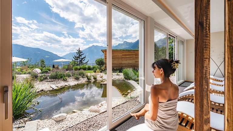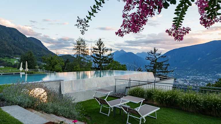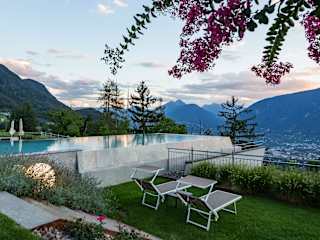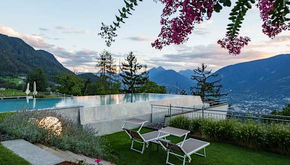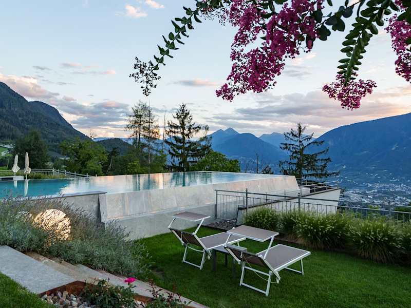 Entspannen Sie in unserem traumhaften Infinity-Pool und genießen Sie die herrliche Landschaft, die den Garten umgibt. Es stehen Ihnen außerdem ein Hallenbad, Whirlpool, verschiedene Saunen, Solarium, Ruheraum und ein Fitnessraum zur Verfügung. Während Sie den Wellnessbereich genießen, können sich die Kinder im Spielzimmer und auf dem Spielplatz austoben oder im Kinderbecken planschen. Nutzen Sie auch die Vielzahl an Freizeitmöglichkeiten in der nahen Umgebung: Spazierwege und Gipfeltouren, die Gärten von Schloss Trautmannsdorf, die Thermen in Meran und andere Aktivitäten wie Mountainbiking, Paragliding, Golfen, Reiten und Rafting.