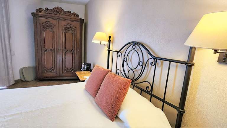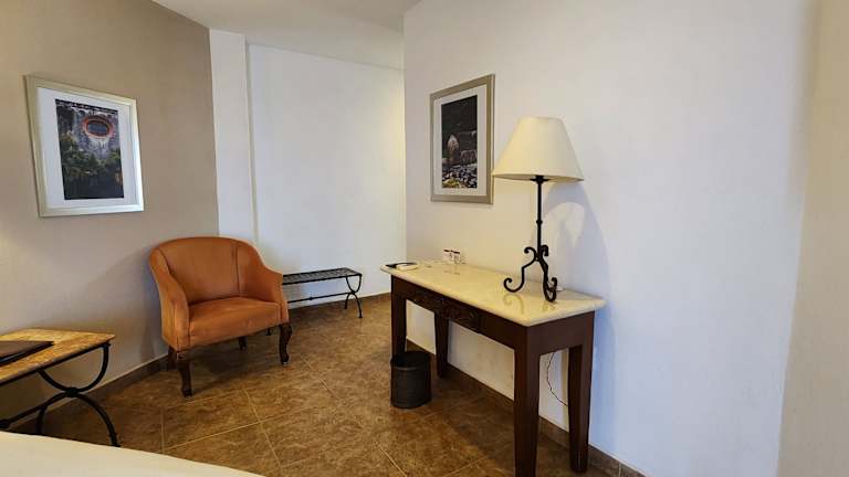 Die klimatisierten Zimmer im Hacienda de Cortés überzeugen durch elegantes Dekor. Besonders die grossen Suiten bieten einen geräumigen Sitzbereich mit Esstisch und Stühlen.