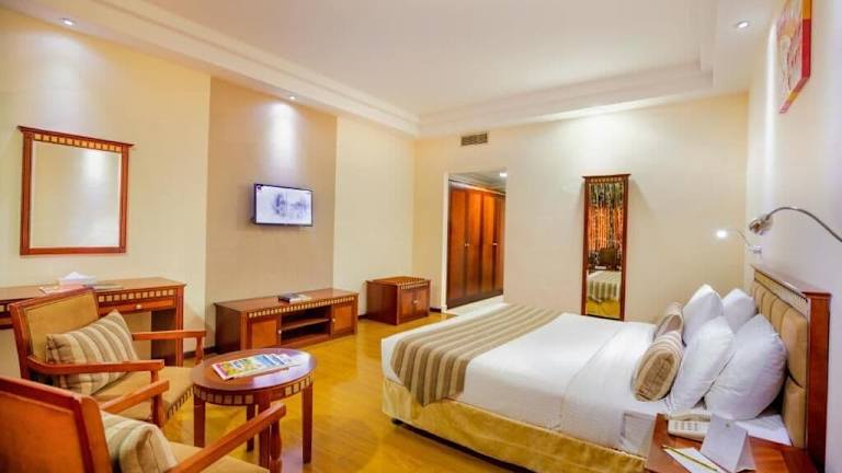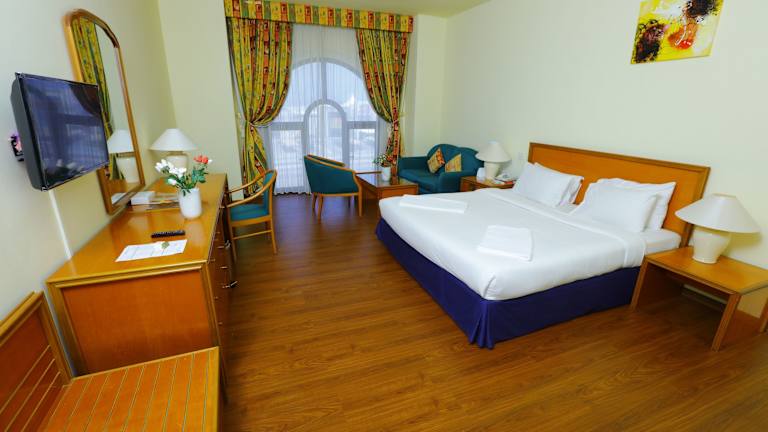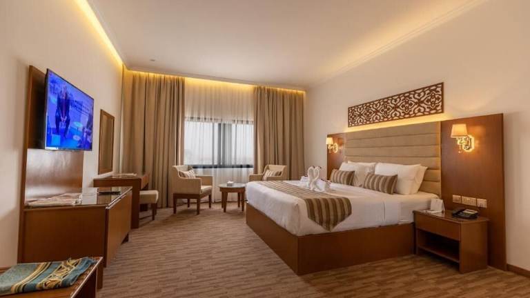 Das Hamdan Plaza Hotel Salalah, ein HTG Hotel, ist das Flaggschiff der Hamdan Group in Salalah. Das Hotel liegt nur 7,6 km vom internationalen Flughafen Salalah entfernt und ist zentral gelegen, in der Nähe der großen Einkaufszentren und des Geschäftsviertels von Salalah. Alle wichtigen Touristenattraktionen sind leicht von hier aus erreichbar. Das Hotel bietet einen herrlichen Blick auf die Stadt Salalah und die Dhofar-Berge. Die Zimmer bieten entweder Blick auf den Palmengarten oder auf die umliegenden Berge und sind klimatisiert. Sie sind mit Sat-TV ausgestattet und einige Zimmer verfügen über einen separaten Wohnbereich. Das private Badezimmer ist mit Bademänteln und Hausschuhen ausgestattet. Das Hamdan Plaza Hotel Salalah, ein HTG Hotel, verfügt über ein Restaurant mit internationaler Küche, in dem Sie jeden Tag ein reichhaltiges Frühstücksbuffet und abends eine Auswahl an internationalen Gerichten genießen können. Zu den Einrichtungen des Hamdan gehören ein Fitnessstudio, ein Tennisplatz, ein Squashplatz, Tischtennis, ein Billardtisch, ein Dampfbad, eine Sauna und ein großer Außenpool mit Sonnenterrasse. Außerdem bietet das Hotel den AlMasa-Saal mit einer Kapazität von 400 Personen, der ideal für Konferenzen, Meetings und große Bankette ist. Kostenfreie Parkplätze stehen vor Ort zur Verfügung und WLAN ist im gesamten Hotel kostenfrei verfügbar.