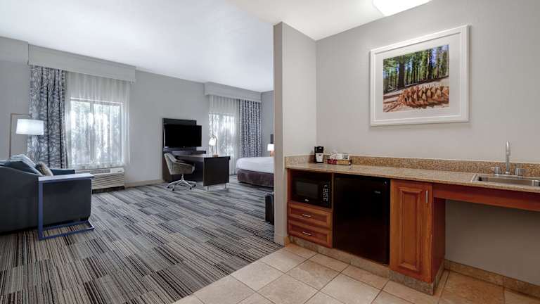 Die Zimmer im Hampton Inn & Suites Tulare sind geräumig und verfügen über ein Wohnzimmer und ein Badezimmer. Ein angenehmes Raumklima wird durch eine Klimaanlage gewährleistet. In den meisten Zimmern gehört eine Terrasse zum Standard. Gäste schlafen auf einem Sofabett, und es sind separate Schlafzimmer vorhanden. Die Zimmer sind mit einem Safe, einer Minibar, einem Kühlschrank, einer Mikrowelle und einer Tee-/Kaffeemaschine ausgestattet. Ein Bügelset sowie ein Telefon, ein TV-Gerät und kostenfreies WiFi sind ebenfalls vorhanden. Die Badezimmer bieten eine Dusche, eine Badewanne und ein Bidet, sowie Bademäntel und Kosmetikartikel. Auch rollstuhlgerechte Zimmer sind verfügbar.