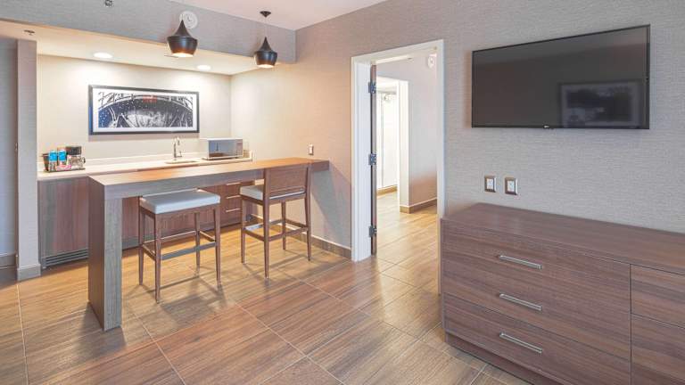 Die Zimmer sind mit einem Wohnzimmer, einer Küche und einem Badezimmer ausgestattet. Sie bieten Klimaanlage, individuell steuerbare Heizung, Kingsizebett, Sofabett, Safe, Minibar, Schreibtisch sowie Kühlschrank und Tee-/Kaffeemaschine. Ein Bügelset, Telefon mit Direktwahl, TV mit Satelliten-/Kabelempfang und kostenfreies Wifi gehören ebenfalls zur Ausstattung. Das Badezimmer ist mit einer Dusche und Badewanne sowie Haartrockner ausgestattet.