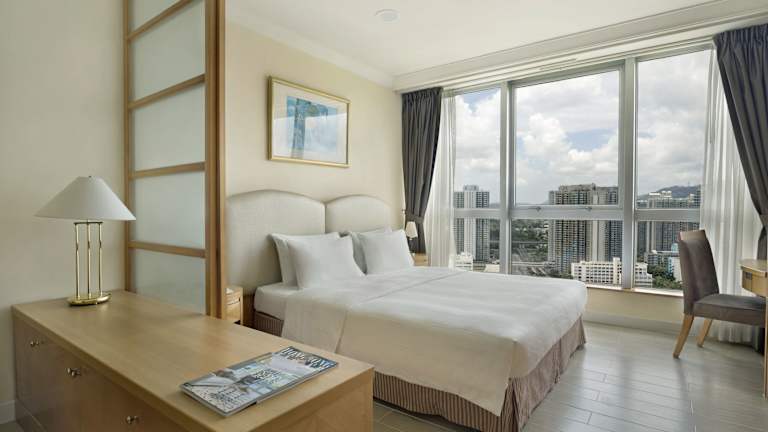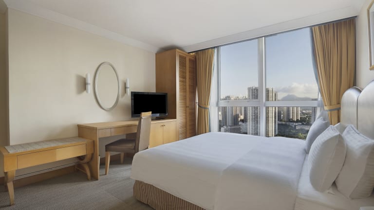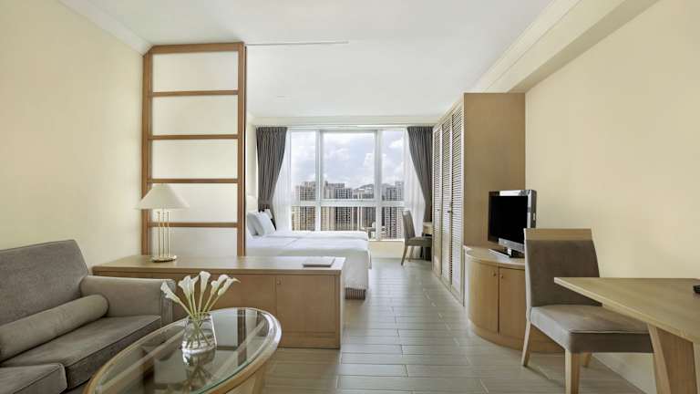Die Zimmer verfügen über eine Klimaanlage, ein Kingsizebett und ein Sofabett. Zustellbetten können angefordert werden. Zur Ausstattung gehören ein Safe, Minibar, Schreibtisch, Kühlschrank und Tee-/Kaffeemaschine. Die Badezimmer sind mit Dusche und Badewanne ausgestattet und beinhalten Haartrockner, Kosmetikartikel sowie Hausschuhe. Es stehen auch rollstuhlgerechte Zimmer zur Verfügung.