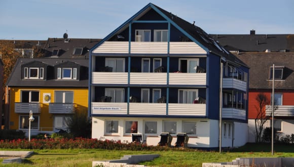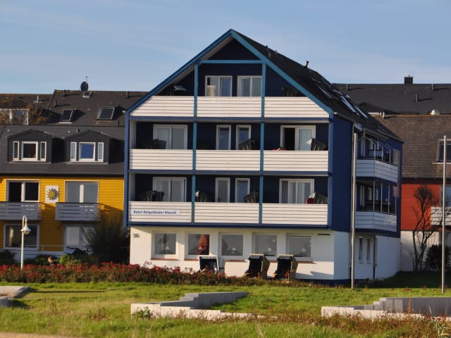Mit freiem Blick über die Nordsee und Düne, sehr ruhig und doch nur 150 m von der Ortsmitte entfernt, so liegt das "Aparthotel Klassik Helgoland". Direkt an der Kurpromenade im Unterland.