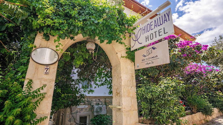 Das Hotel Hideaway liegt in Kaş, direkt am Strand und nur 5 Gehminuten vom Stadtzentrum entfernt. Es bietet einen Blick auf das Mittelmeer sowie einen Garten mit Olivenbäumen.