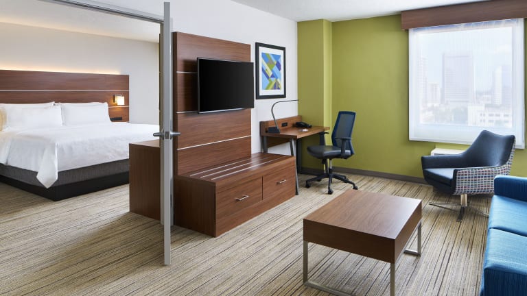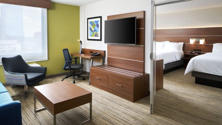 Die Zimmer im Holiday Inn Express sind hell und modern eingerichtet und verfügen über eine Klimaanlage sowie eine Heizung. Jede Unterkunft ist mit einem Doppelbett, einem Queensize-Bett oder einem Kingsize-Bett ausgestattet. Zustellbetten können auf Wunsch angefordert werden. Zur Ausstattung gehören ein Safe, ein Schreibtisch, ein Kühlschrank, eine Mikrowelle und eine Tee-/Kaffeemaschine. Die Badezimmer sind mit einer Dusche und einer Badewanne ausgestattet und bieten Kosmetikartikel sowie einen Haartrockner. WLAN ist in allen Zimmern kostenlos.