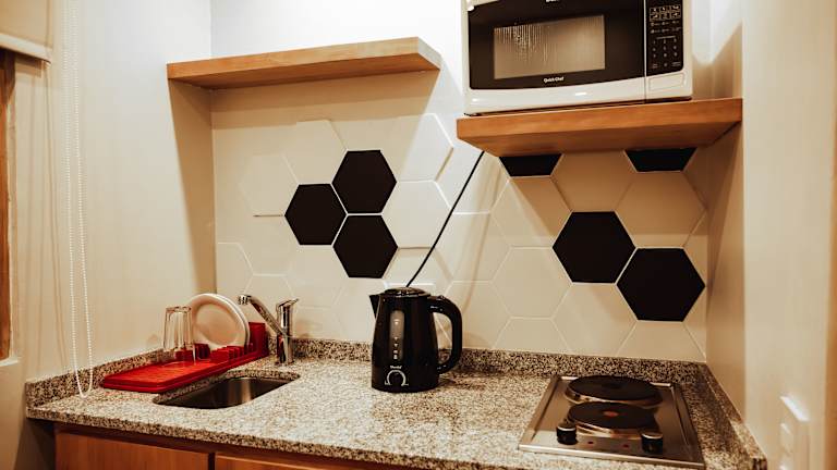 Im gemütlichen Essbereich wird täglich ein reichhaltiges Frühstücksbuffet serviert. Zusätzlich steht eine Gemeinschaftsküche mit Küchengeräten und Mikrowelle zur Verfügung, die von allen Gästen genutzt werden kann.