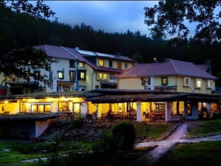 Das Hotel Hüttenmühle befindet sich in Hillscheid, umgeben von Bäumen und in malerischer Lage. Die Autobahn A48 ist in 10 Fahrminuten erreichbar, wodurch das Hotel einen guten Ausgangspunkt für Ausflüge bietet.