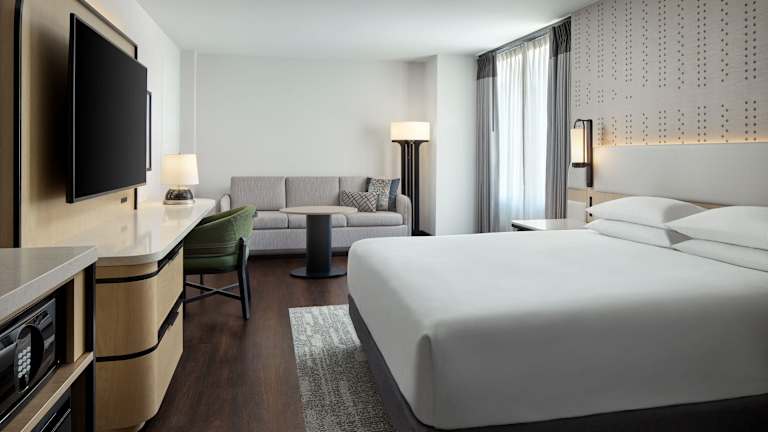 Die Zimmer sind mit einer Klimaanlage, Heizung, einem Kingsizebett und einem Sofabett ausgestattet. Zudem bieten sie Annehmlichkeiten wie einen Kühlschrank, Tee- und Kaffeekocher, WLAN (ohne Gebühr), einen Safe und ein Badezimmer mit Dusche und Badewanne. Rollstuhlgerechte und Nichtraucherzimmer sind ebenfalls verfügbar.