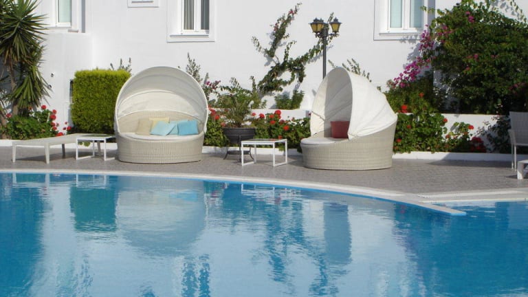 Das Hotel befindet sich in Kamari an der Küste von Santorini, direkt am Aghia Paraskevi Strand, in der Nähe von Monolithos. Der Strand ist ein Sandstrand, und es gibt Sonnenschirme sowie Liegen (gegen Gebühr) zur Verfügung. Die Entfernung zum Flughafen beträgt ca. 4.7 km, während das Stadtzentrum ca. 7.6 km entfernt ist.