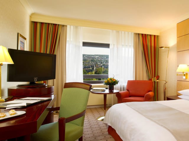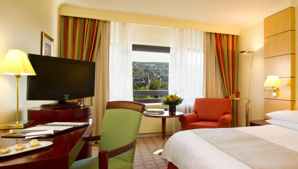 Die 467 zeitlos eleganten Zimmer garantieren Komfort auf höchstem Niveau und einen erholsamen Aufenthalt. Genießen Sie einen fantastischen Blick über die Frankfurter Skyline und den Main.