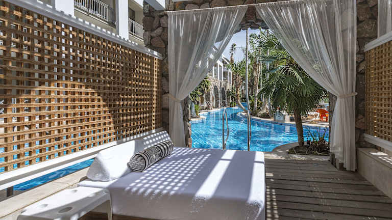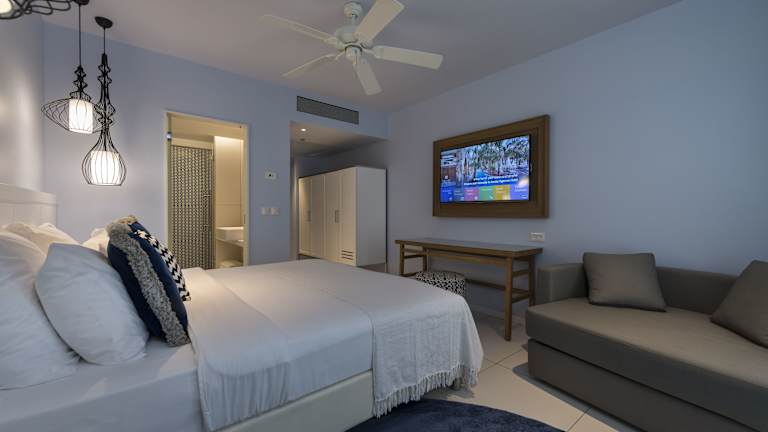 Die Zimmer sind elegant und geräumig. Es gibt verschiedene Zimmerkategorien, darunter Doppelzimmer mit Poolblick und Familienzimmer. Alle Zimmer sind Nichtraucherzimmer und verfügen über Klimaanlage, einen Safe, einen Kaffee-/Teezubereiter, WLAN/WiFi ohne Gebühr, einen Fernseher sowie einen Balkon oder eine Terrasse.