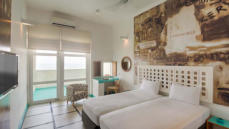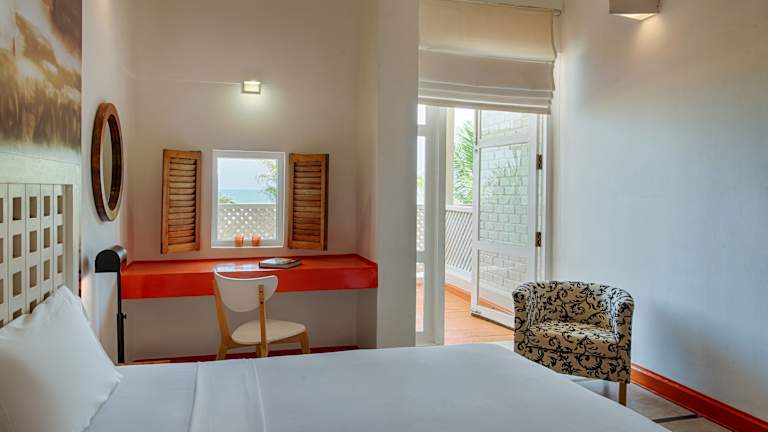 Die komfortablen Zimmer sind schlicht eingerichtet und verfügen über eine Klimaanlage, einen Ventilator sowie Fliesenboden. Jedes Zimmer bietet einen Balkon oder eine Terrasse mit Meerblick, ein Doppelbett oder Queensize-Bett, einen Schreibtisch, ein TV-Gerät mit Satelliten-/Kabelempfang, ein Badezimmer mit Dusche und Badewanne sowie Kosmetikartikel. Zusätzliche Annehmlichkeiten sind eine Kochnische mit Kühlschrank, ein Safe und ein Bügelset. Sowohl Nichtraucher- als auch Raucherzimmer sind verfügbar.