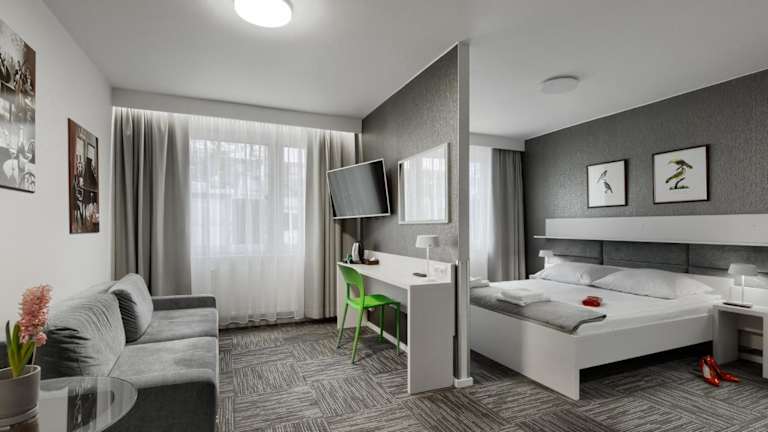 Das Jantar Resort in Stettin bietet einfache, funktionale und erschwingliche Unterkünfte in ruhiger Lage am Stadtrand. Die geräumigen Studios und Apartments sind mit allen notwendigen Annehmlichkeiten ausgestattet und bieten mehr Platz als herkömmliche Hotelzimmer. Das Resort verfügt über ein Restaurant, einen Konferenzraum und einen Clubraum. Die Rezeption ist rund um die Uhr geöffnet. Die Lage des Resorts ermöglicht es den Gästen, die Innenstadt von Stettin leicht zu erreichen und in der Nähe verschiedene Freizeit- und Sportmöglichkeiten zu nutzen, darunter ein öffentliches Schwimmbad, ein Sportstadion, eine Radrennbahn und Tennisplätze. Der See Głębokie mit seinem Stadtstrand ist ebenfalls in der Nähe.