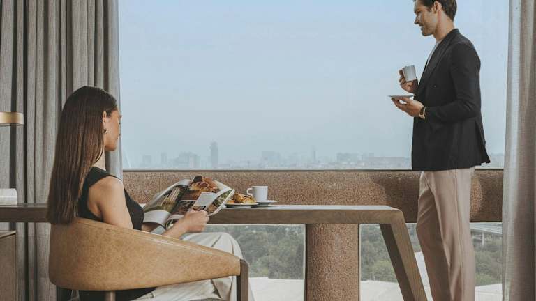 Die Zimmer sind modern eingerichtet und verfügen über eine Klimaanlage, individuell steuerbare Heizung, ein Kingsizebett sowie ein Sofabett. Ein Safe, eine Minibar, ein Schreibtisch, Kühlschrank, Mikrowelle und Tee-/Kaffeemaschine sind ebenfalls vorhanden. Zudem gibt es einen Fernseher mit Kabel- und Satellitenempfang, WiFi ohne Gebühr sowie Hausschuhe. Die Badezimmer sind mit Dusche und Badewanne ausgestattet, und es stehen Bademäntel und Kosmetikartikel zur Verfügung.