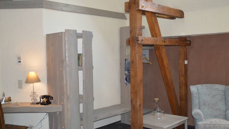 Ruhige, individuell eingerichtete Zimmer im Landhausstil mit Holzmöbeln sowie einen antiken Wasserkrug und Waschbecken.