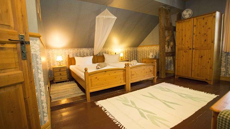 Das historische, umweltfreundliche Hotel Kolonieschänke begeistert mit einer heimeligen Atmosphäre und individuell eingerichteten Zimmern im Landhausstil, welche über Holzmöbel, einen antiken Wasserkrug und ein Waschbecken verfügen.