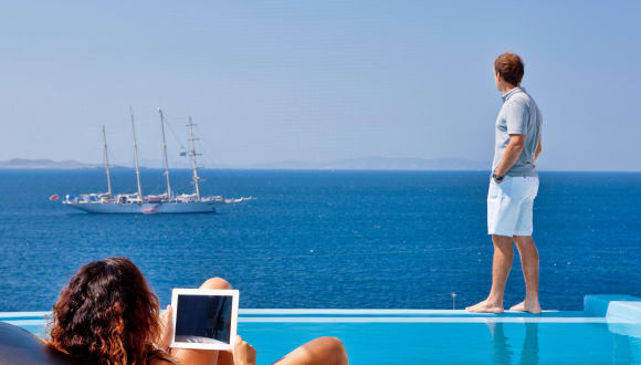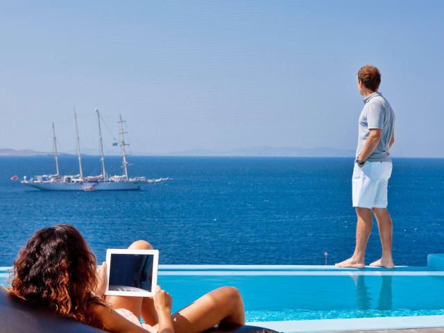 Fine dining with sunset views Get ready for a romantic evening facing a stunning sunset view and Mykonos town. Our restaurant’s atmosphere will seduce even the most demanding guests and provide the perfect setting for a romantic seaview dinner. Our seaview restaurant serves high-end gastronomy, prepared exclusively by our chef with the finest ingredients, offering you a true taste of Mykonos. We also feature a fine wine list in a tranquil lounge atmosphere.