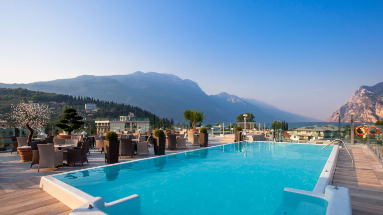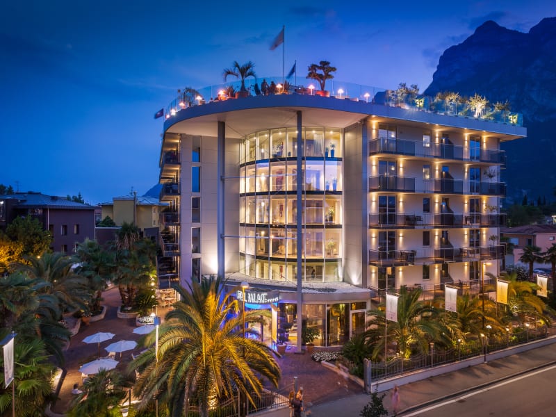 Der Sky Pool auf der obersten Etage ist ein einzigartiger Ort am Gardasee, wo Sie das herrliche Panorama bewundern und unvergessliche romantische Momente verbringen können. Die stilvolle Dachterrasse ist an den warmen Sommernachmittagen, das ideale um sich die Sonne auf den bequemen Sonnenliegen zu genießen, im Pool zu schwimmen und sich im Whirlpool, bei einem frischen Cocktail zu entspannen. Abends färbt sich die Terrasse mit ganz anderen Tönen, und bietet Live Musik und vieles mehr an.