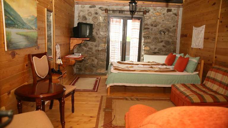 Die Zimmer im Hotel Kula Damjanova sind liebevoll eingerichtet und im Stil der Region gestaltet. Sie verfügen über handgefertigte Teppiche und Textilien, Holzböden, Wände aus Naturstein und einen Flachbild-Kabel-TV. Jedes Zimmer bietet eine gemütliche und authentische Atmosphäre, in der Sie sich wie zu Hause fühlen können. Die öffentlichen Bereiche des Hotels sind ebenfalls im regionaltypischen Stil eingerichtet und verfügen über geschnitzte Holzmöbel und eine Bar mit Kamin. Kostenloses WLAN steht den Gästen in den öffentlichen Bereichen des Hotels zur Verfügung.