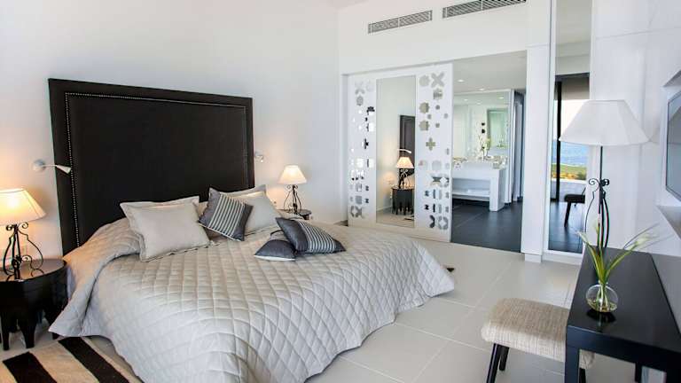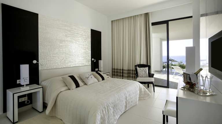 Die Zimmer sind modern eingerichtet und verfügen über individuelle Klimaanlagen, einen Safe und kostenfreies Wifi. Es stehen verschiedene Zimmertypen zur Verfügung, darunter Juniorsuiten und Suiten mit teilweise Meerblick, welche über Balkone mit Sitzgelegenheiten verfügen.