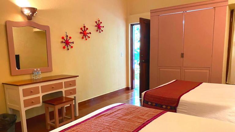 Die Zimmer sind schlicht mit Holzmöbeln und Fliesenböden eingerichtet. Sie verfügen über eine Klimaanlage, einen Balkon oder eine Terrasse, ein Doppelbett oder Kingsize-Bett, einen Fernseher sowie ein eigenes Badezimmer mit Dusche und Badewanne. Die Zimmer sind zudem mit einem Safe ausgestattet, in dem Wertsachen sicher aufbewahrt werden können.