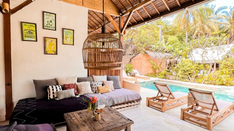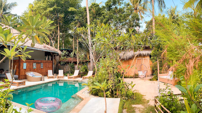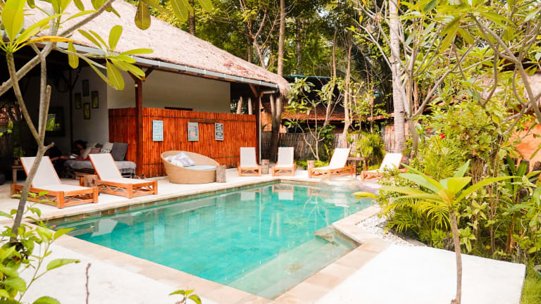 Das La Cocoteraie Ecolodge befindet sich in einer malerischen Kokosnussplantage auf Gili Trawangan, in der Nähe des Aussichtspunktes am Strand. Der Hafen von Gili Trawangan ist mit einer kurzen Fahrt in einer Pferdekutsche erreichbar, und der Hauptstrand sowie zahlreiche gastronomische Einrichtungen sind nach einer 15-minütigen Velofahrt zugänglich.