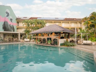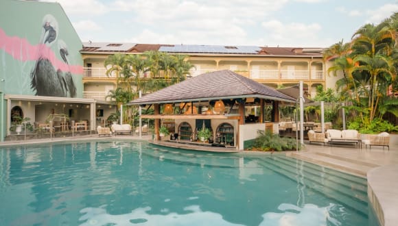 The Pitaya Restaurant The Pitaya (max. 120 guests) welcomes you in a spacious and modern area overlooking the garden and the swimming pool. Buffet Breakfast from 6 to 10 a.m. Semi-gourmet dinner from 7 to 10 p.m. The Tropical Café Situated in the lobby and with a view on the garden, the Tropical Café invites you in a musical and ‘tropical’ atmosphere every day from 5.30 p.m. up to 11 p.m. Local artists shows several times a week in high season ! The Palm Bar At the edge of the swimming pool, our pool bar has been completely renovated in 2023, and opened every day from 10 a.m. to 6 p.m. Cocktails, and sweet and savory local snacks can be tasted feet in the water.