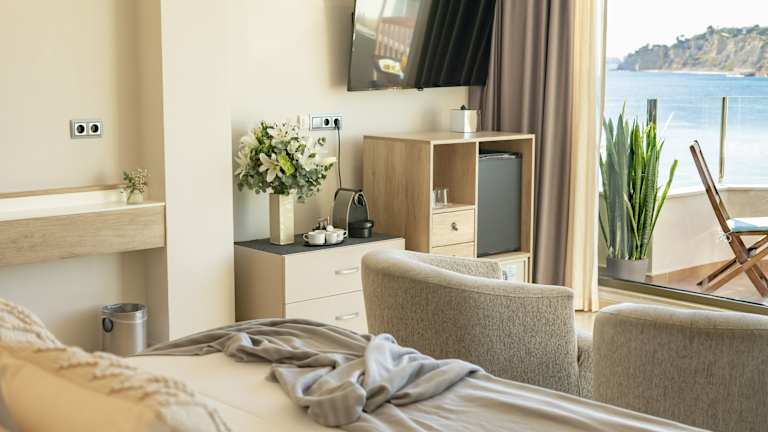Die Zimmer des Hotels sind geräumig und hell gestaltet. Jedes Zimmer ist mit einer Nespresso Kaffeemaschine, einem Fernseher und einer Minibar ausgestattet. Zudem verfügen alle Zimmer über ein privates Badezimmer mit Bademänteln, Hausschuhen, Toilettenartikeln und einem Haartrockner. Haustiere bis 6 kg sind in Zimmern mit Terrasse oder in den Deluxe Zimmern gestattet.