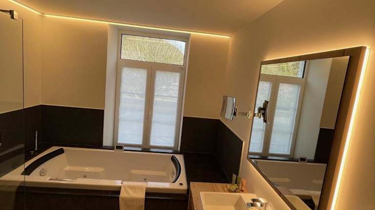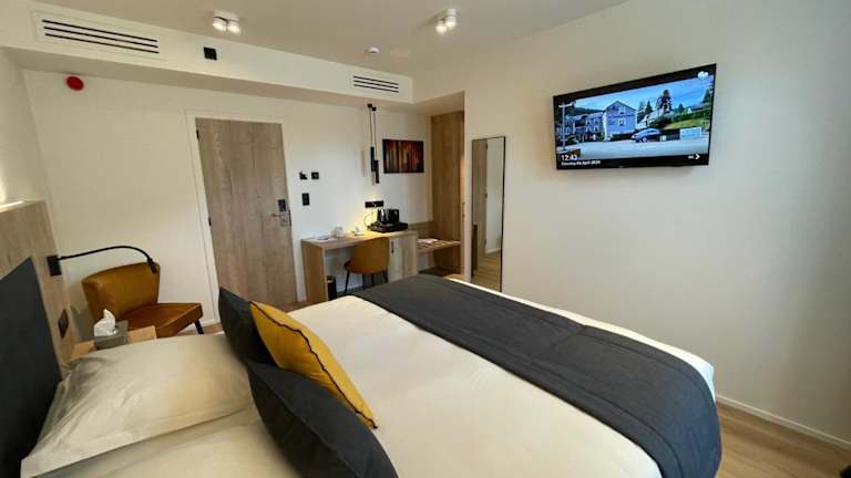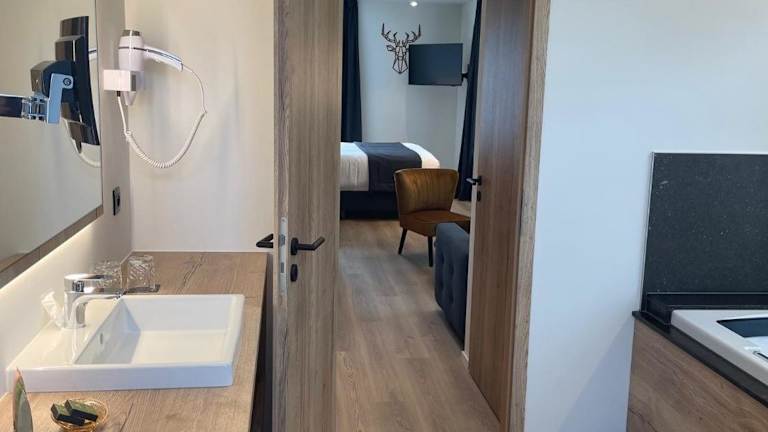 Die in Rot gestalteten Zimmer des Le Charme de la Semois verfügen über einen Balkon, grosse Fenster, einen Sitzbereich, einen Schreibtisch und einen Flachbild-TV. Die Badezimmer sind mit einer Badewanne oder einer Dusche ausgestattet. Weiterhin stehen Haartrockner und kostenlose Pflegeprodukte zur Verfügung.