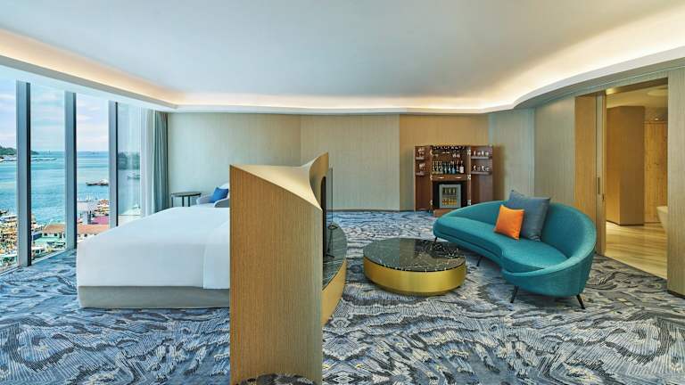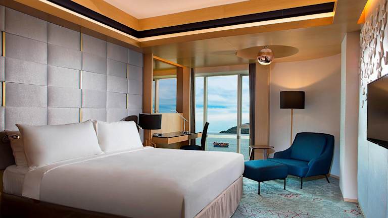 Die Zimmer sind elegant eingerichtet und bieten eine Klimaanlage, Heizung, Meer- oder Stadtblick und sind mit Teppichboden ausgestattet. Zu den Annehmlichkeiten gehören ein Safe, eine Minibar, ein Schreibtisch sowie ein Kühlschrank und eine Tee-/Kaffeemaschine. Kostenloses Wifi, ein TV mit Satellitenempfang und ein Radio stehen zur Verfügung. In den Badezimmern finden die Gäste eine Dusche und eine Badewanne, Haartrockner und Pflegeprodukte. Es sind auch rollstuhlgerechte Zimmer buchbar.