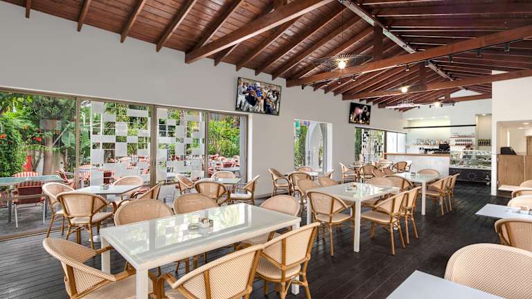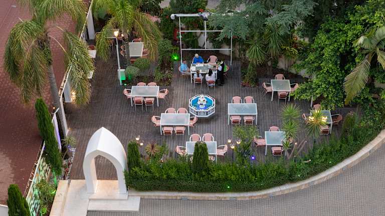 Zu den gastronomischen Einrichtungen zählen ein Frühstückssaal, ein Café und ein Restaurant, das orientalische und internationale Gerichte serviert. Ein reichhaltiges Frühstücksbuffet sorgt täglich für einen guten Start in den Tag. Snacks und Getränke sind an der Bar oder am Grillplatz im Garten erhältlich.