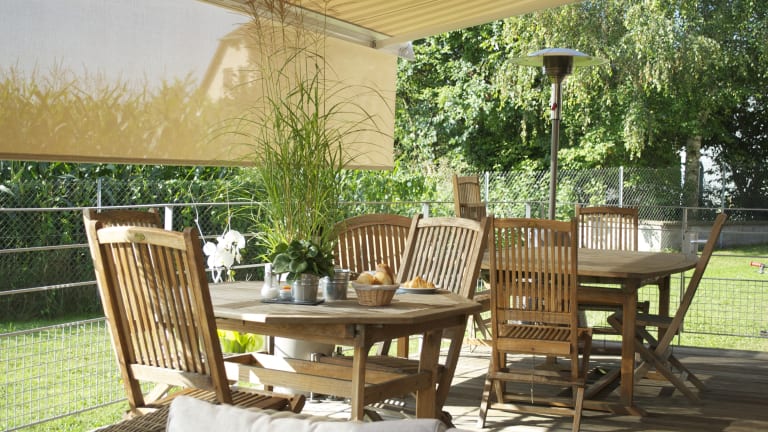 Picknickplatz Gartenmöbel Sonnenterrasse BBQ-Installation Terrasse Garten Spielplatz mit Rutsche Ping Pong Basket- Ball Fahrrad