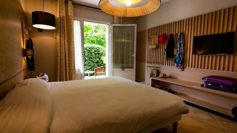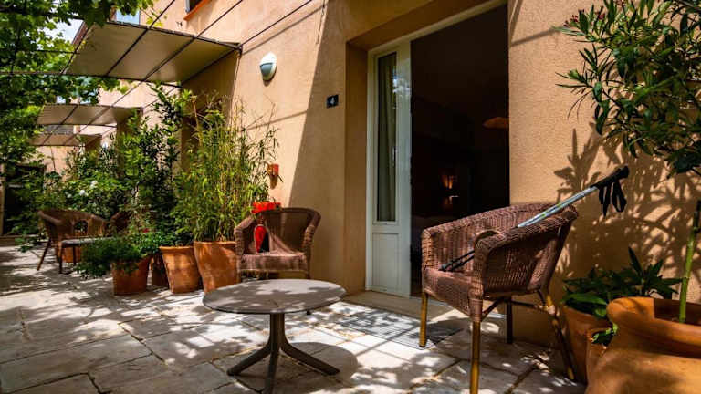 Das im provenzalischen Stil gehaltene Hotel bietet eine heimelige Atmosphäre und eine einladende, begrünten Terrasse. Die Gäste können den Panoramablick auf die Natur geniessen.