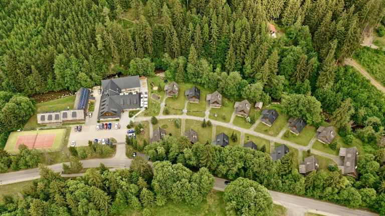 Jedes Chalet enthält zwei Schlafzimmer und ein Badezimmer auf der oberen Etage. Im Erdgeschoss ist ein gemütlicher Wohnbereich mit Kamin, ein zusätzlicher Badraum und eine Terrasse vorhanden. Die Ausstattung umfasst Kabel-TV, einen Kühlschrank, Wasserkocher sowie einfaches Besteck. Schallisolierte Zimmer sind ebenfalls verfügbar. Haustiere sind auf Anfrage erlaubt.