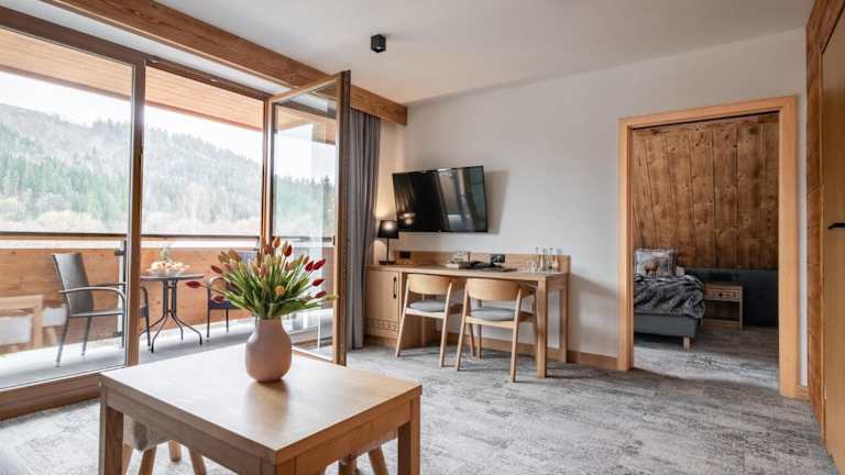 Nach einem Tag Skifahren oder Velofahren haben die Gäste die Möglichkeit, in der Gemeinschaftslounge zu entspannen. Die nahegelegenen Berge und Thermen laden zu weiteren Aktivitäten ein.