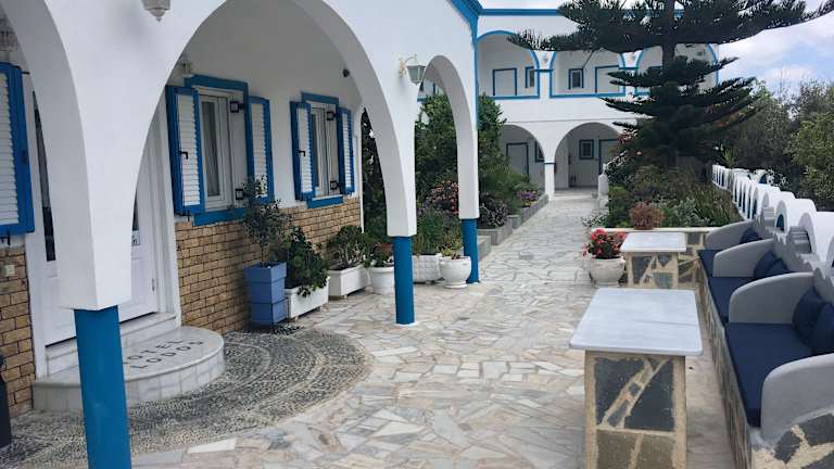 Das Hotel Lodos ist ein kleines Hotel, das sich auf Erwachsene spezialisiert hat. Es bietet eine komfortable Unterkunft in günstiger Lage und ist im traditionellen Kykladenstil gestaltet. Die dekorativen Elemente mit malerischen Bögen und Säulen harmonieren perfekt mit den traditionellen Farben des Gebäudes in Weiss und Blau.