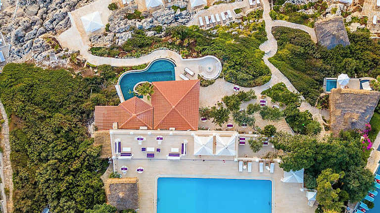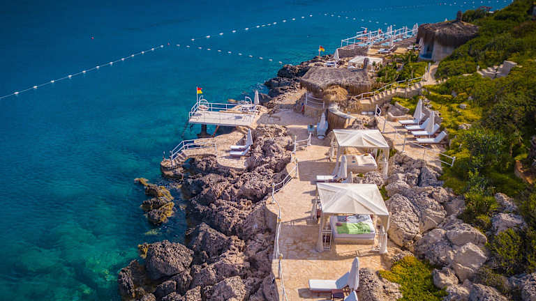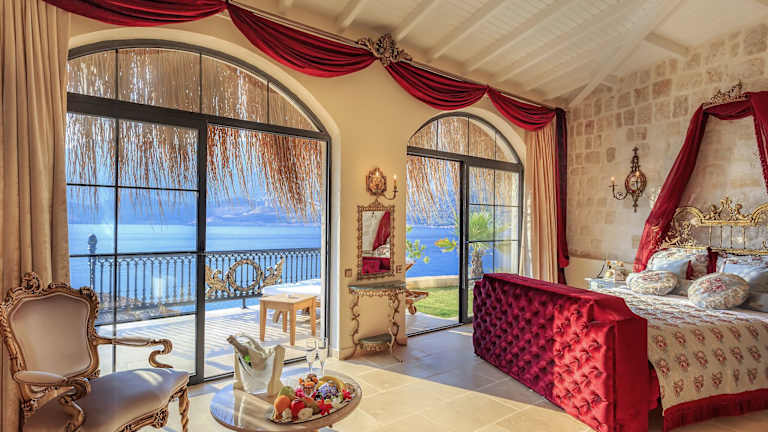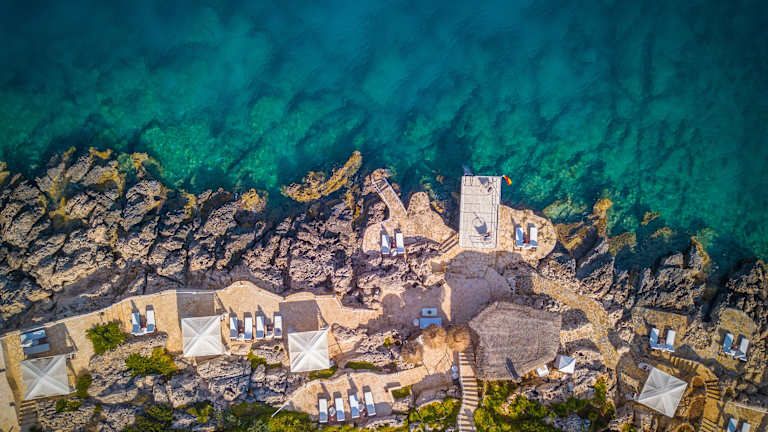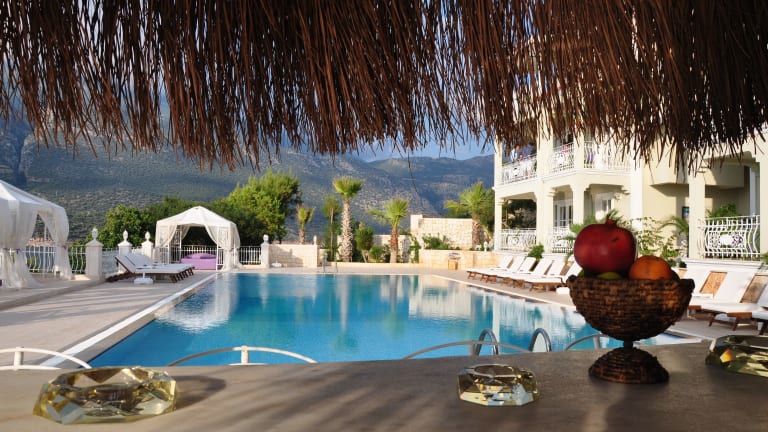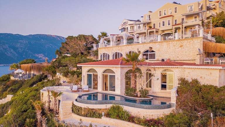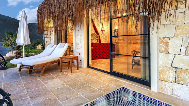 Das Hotel liegt auf einer Felsenklippe in Kaş, nur eine 8-minütige Fahrt vom Zentrum entfernt. Es bietet einen eigenen Strand und eine traumhafte Aussicht auf das Mittelmeer.