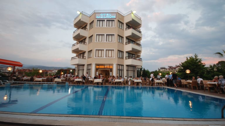 Das Hotel Malhun in Fethiye ist ein beliebtes Hotel direkt am Strand, nur durch die Uferpromenade getrennt. Es bietet eine entspannte Atmosphäre und ist ideal für Paare und Familien. Das Hotel verfügt über ein Restaurant, zwei Bars und ein Café, in dem Sie sich kulinarisch verwöhnen lassen können. Der Außenbereich mit Sonnenterrasse und zwei Pools lädt zum Entspannen ein. Die Zimmer sind komfortabel ausgestattet und bieten einen Balkon mit Blick auf das Meer oder den Garten.