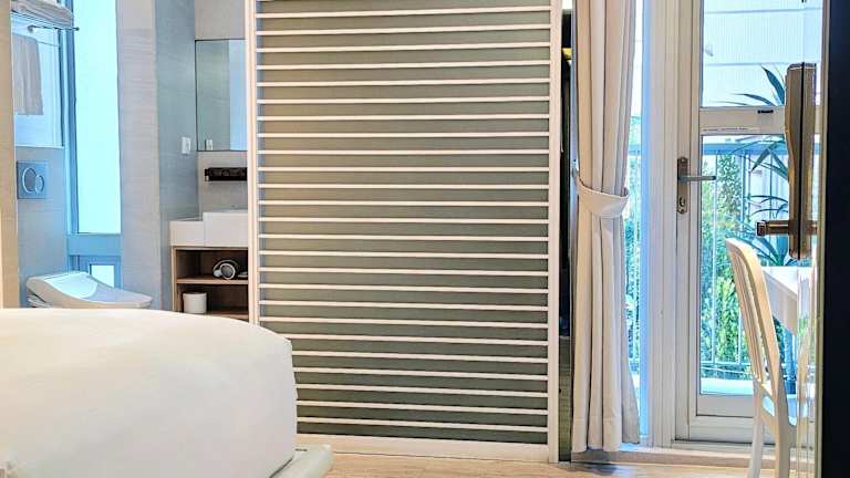 Die klimatisierten Zimmer sind schlicht und modern eingerichtet und verfügen über einen TV sowie ein eigenes Bad mit ebenerdiger Dusche und Bidet. Einige Zimmer bieten zudem einen Whirlpool. Zur Ausstattung gehören auch Hausschuhe, kostenfreie Pflegeprodukte, ein Haartrockner, ein Kühlschrank und ein Wasserkocher.