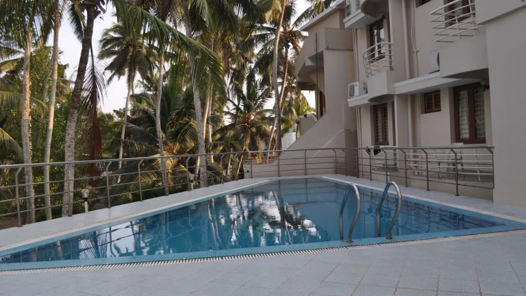 Das Hotel Marine Palace ist der ideale Ort für einen entspannten Strandurlaub in Kovalam. Mit seiner günstigen Lage nur 5 Gehminuten vom Strand entfernt und nur 20 Fahrminuten vom Flughafen Trivandrum bietet das Hotel seinen Gästen Komfort und Bequemlichkeit. Genießen Sie den Außenpool, lassen Sie sich mit Ayurveda-Massagen verwöhnen und bleiben Sie mit kostenlosem WLAN in den öffentlichen Bereichen immer verbunden. Das freundliche Personal steht Ihnen zur Seite, um Besichtigungstouren und Reisen zu organisieren, und es werden auch Yoga- und Meditationsprogramme angeboten. Im hoteleigenen Restaurant können Sie köstliche Meeresfrüchte und eine Auswahl indischer Gerichte genießen, sowohl vegetarische als auch nicht-vegetarische Optionen stehen zur Verfügung. Der Bahnhof Trivandrum ist nur 15 km entfernt und kostenlose Parkplätze stehen Ihnen zur Verfügung.