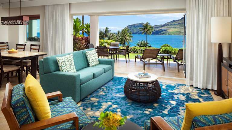 Das Marriott's Kauai Lagoons - Kalanipu'u Resort bietet 75 geräumige Villen im Inselstil. Jede Villa verfügt über einen eigenen Balkon, eine voll ausgestattete Küche und mehrere Badezimmer. Die Villen sind im Inselstil eingerichtet und bieten modernen Komfort wie Flachbild-TVs, kostenfreies WLAN und eine Waschmaschine mit Trockner. Ein separater Essbereich und ein Wohnzimmer mit einem Schlafsofa sorgen für zusätzlichen Komfort.