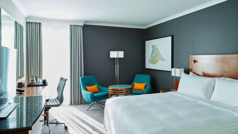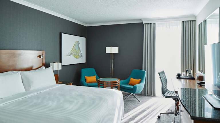 Die Zimmer sind mit Klimaanlage, Heizung und schallisolierten Fenstern ausgestattet. Sie verfügen über ein Doppelbett oder ein Kingsize-Bett, einen Safe, eine Minibar, einen Schreibtisch und eine Tee-/Kaffeemaschine. Im Badezimmer finden die Gäste eine Dusche, Bademäntel sowie Hausschuhe. Rollstuhlgerechte Zimmer mit barrierefreiem Badezimmer stehen ebenfalls zur Verfügung, ebenso wie Familien- und Nichtraucherzimmer.